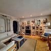 Zur rechten Seite schließt sich das sehr individuell gestaltete Wohnzimmer an. Es besticht durch seine kleinen doppelflügeligen Fenster, einem Echtholz-Dielenfußboden und einem alten dekorativen Kamin und Deckenspots.