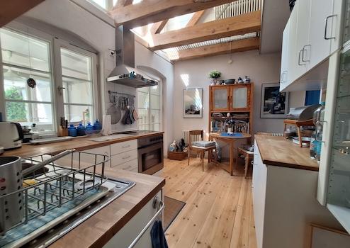 Gleich hinter dem Wohnzimmer eröffnet sich Ihnen die zentral gelegene Küche. Sie verfügt über eine Einbauküche mit weißen Fronten und einer hölzernen Arbeitsplatte, Platz für einen kleinen Esstisch und einen Zugang zum Wintergarten. Hier finden Sie an einem großen Esstisch Platz für die ganze Familie. Nutzen Sie ihn für gemeinsame Abendessen oder Spieleabende! Besonderes Highlight in der Küche ist die offene Decke. Durch die ursprünglich sehr niedrigen Decken des alten Fachwerkhauses wurde im Rahmen der Kernsanierung die Küchendecke geöffnet, um ein großzügiges Raumgefühl zu schaffen.