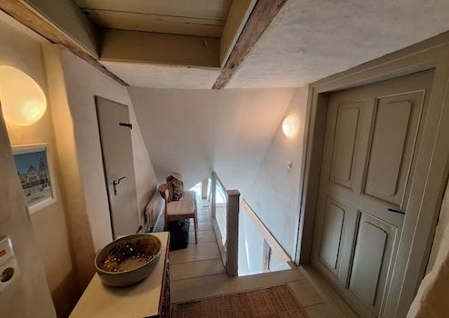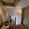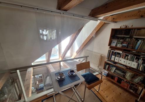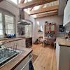 Galerie, die sich als Arbeitsplatz eignet und Blick in die darunterliegende Küche. Von der Galerie aus erreichen Sie den Ausgang auf die Dachterrasse. Hier haben Sie den perfekten Blick auf Ihr neues Grundstück. Die offenen Balken und die schweren Türen zusammen mit den Echtholzdielen lassen das Haus auch hier wieder warm und gemütlich wirken.