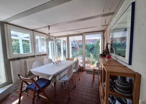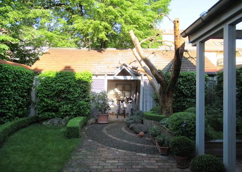 Auf dem ca. 216 m² großen Grundstück befinden sich zudem eine Remise mit zusätzlichem Schuppen. Sie ist ebenfalls im Stil des Hauses errichtet und rekonstruiert worden. Sehr einladend empfängt sie Sie über eine zweiflügelige Glastür. Dieser hofseitige Eingang zum Grundstück konnte früher auch mit dem Auto befahren werden. Hierfür müsste ein Wegerecht angefragt werden.