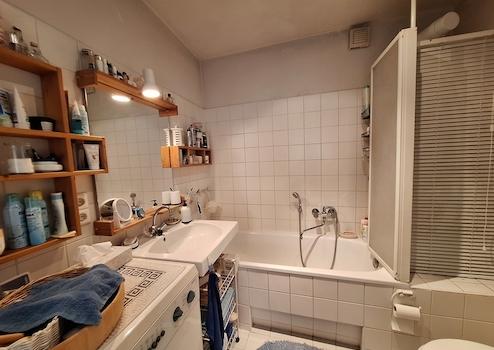 Über die Ankleide und einen kleinen Flur erreichen Sie das hell geflieste Wannenbad. Der ursprüngliche Raum wurde durch hochwertige Glaselemente getrennt und der Bereich des Bads privater gestaltet. Der offene Bereich als Durchgang von Ankleide zum zentralen Flur dient somit als kleiner Hauswirtschaftsraum mit viel Staufläche.