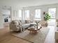 •Design-Update: Heller Eichenboden in allen Wohnräumen kombiniert mit eleganten weißen Türen und Zargen sowie schwarzen Drückergarnituren.
