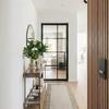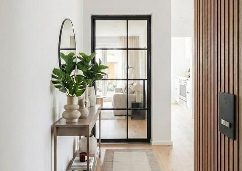 •Lichtkonzept & Entree: Eingangsbereich mit stilvollen Akustik-Paneelen und einer klaren Glastür zum Wohnzimmer für ein offenes, helles Raumgefühl.