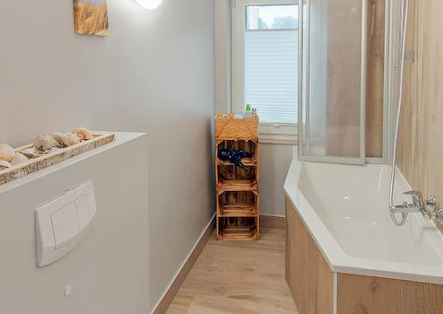 Das Erdgeschoss wurde 2021 modernisiert. Hier erschließen sich Wohnbereich, Küche, zwei Schlafräume, Ankleidezimmer sowie zwei schicke Bäder mit Dusche und Wanne. Das Duschbad grenzt en suite an einen der beiden Schlafräume an.