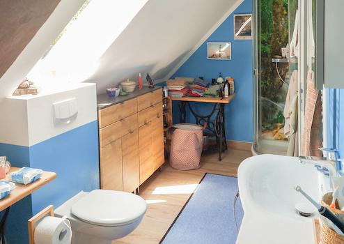 Das Dachgeschoss ist über einen separaten Hauseingang erreichbar und wurde 2019 modernisiert. Offene Holzbalken sorgen für ein gemütliches Wohnambiente. Hier stehen Wohnbereich, eine offene Wohnküche, drei Schlafräume, Ankleidezimmer sowie ein schickes Duschbad mit angrenzendem Hauswirtschaftsraum zur Verfügung. Die Wohnküche verfügt über einen Kaminanschluss.