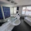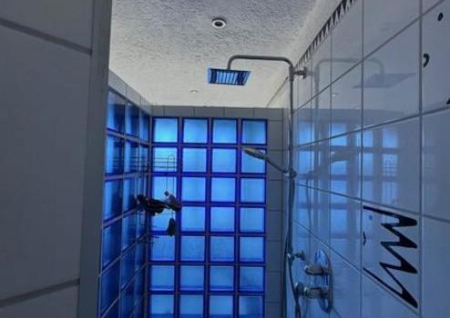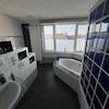 Geradeaus vom Eingangsbereich aus liegt der Zugang zur Hauptwohnung. Beim Betreten öffnet sich hier ein großzügiger Loftbereich. Auf der rechten Seite befindet sich das Badezimmer, ergänzt durch einen separaten Heizungsraum mit Waschmaschinenanschluss. Das Badezimmer ist mit einer barrierefreien Dusche, einer Eckbadewanne, WC, Bidet, Hygienebereich sowie einem Fenster ausgestattet.