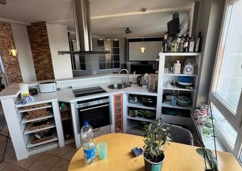 Diese umfasst eine Küche mit vorhandenen Anschlüssen (derzeit ohne Einbauküche), eine ca. 9 m² große Loggia in Form eines überdachten Balkons sowie ein Schlafzimmer mit begehbarem Kleiderschrank. Über einen Durchgang mit Garderobenbereich besteht zudem eine Verbindung zum Flur der Hauptwohnung. Die Einliegerwohnung ist als Zwei-Zimmer-Wohnung konzipiert und verfügt über ein Badezimmer mit Dusche.