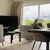 Das Wohnzimmer verfügt über eine 6 m bodentiefe Fensterfront mit Fernsicht und Austritt auf den Balkon
