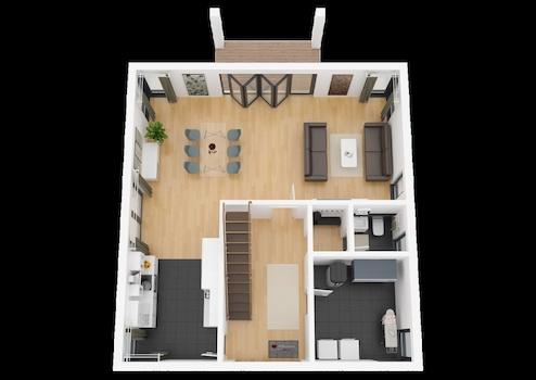 Im Erdgeschoss befindet sich ein geräumiger Wohn-/Essbereich mit separater, aber offen gestalteter Küche. Der Wohnbereich öffnet sich mit bodentiefen Fenstern zur überdachten Terrasse und zum Garten. Neben der Diele befinden sich ein Hauswirtschafts- und Technikraum und ein Gäste-WC. Besonders praktisch ist der direkte Zugang von der Diele in die Küche, so können die Einkäufe schnell versorgt werden. Ins Obergeschoss gelangt man über eine Massivholztreppe.