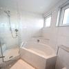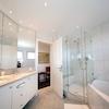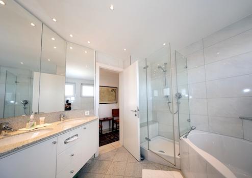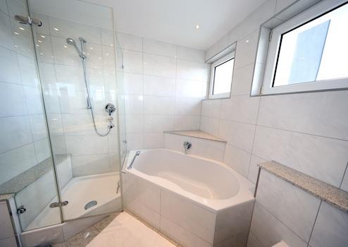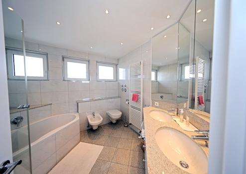 -Tageslichtbad mit Echtglasdusche und separater Eckbadewanne, Doppel-Granit-Waschtisch mit Unterschrank, WC, Bidet, Spielschrank und Handtuchheizkörper (individueller Bad-Ausbau)