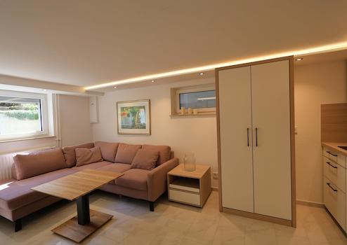 Neues hochwertiges voll möbliertes 1-Zimmer-Appartmenet mit separatem Eingang und Videosprechanlage, Schlafeckcouch, Einbaumöbel mit Eck/Computerschreibtisch und Wandklappbett sowie eine vollausgestattete Küchenzeile. Bodenebener Glas-Dusche, Waschtisch und WC in separatem Raum an eine deutschsprachige, männliche Person/Pendler, Nichtraucher ohne Haustiere nach Absprache zu vermieten.