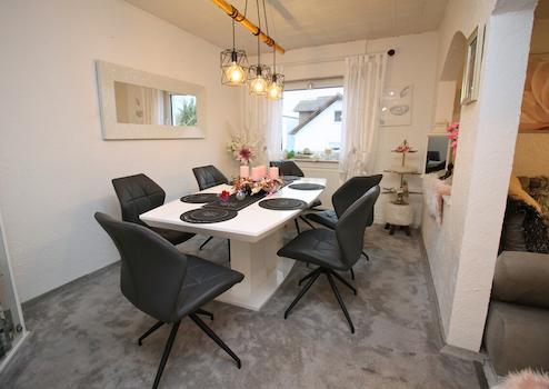 Im Erdgeschoss befindet sich ein Friseurgeschäft und ein Beautyraum mit gut nutzbaren, hellen Arbeitsbereichen. Die gezeigten Räume wirken gepflegt und funktional, mit mehreren Arbeitsplätzen und einem separaten Bereich für Empfang und Ablage. Damit ist die Gewerbeeinheit klar vom Wohnen getrennt und bietet eine solide Basis für den laufenden Betrieb.