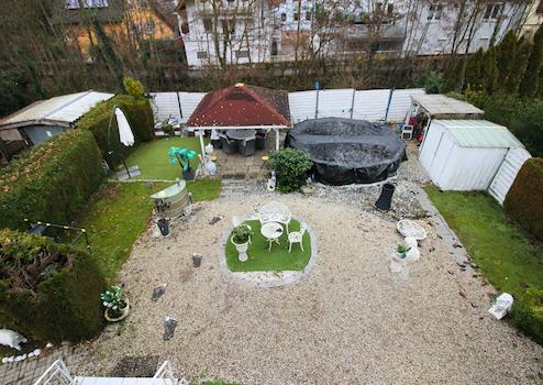 Auch der Außenbereich bietet Mehrwert: Der Garten ist überwiegend pflegeleicht angelegt und verfügt über eine überdachte Sitzmöglichkeit, die sich gut für entspannte Stunden im Freien eignet.