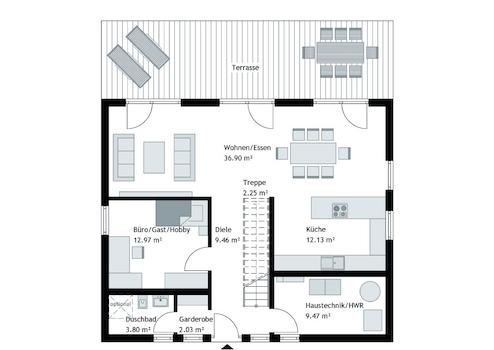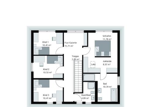 Das gedämmte Dach (= Walm- & Satteldach) rundet die Stadtvilla nicht nur optisch ab, sondern schafft zusätzlich sinnvollen Stauraum. Technik, Koffer, Erinnerungen. Alles findet seinen Platz, ohne Ihren Wohnraum zu stören. Bei einer Flachdachvariante haben Sie den Vorteil, dass Sie die Photovoltaikanlage perfekt ausrichten können.
