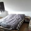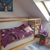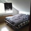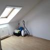 Im Elternschlafzimmer wurde ebenfalls ein Laminatboden verlegt. Obwohl im Bereich der Fenster eine Dachschräge vorhanden ist, bietet die gegenüberliegende Seite die Möglichkeit zum Stellen eines drei Meter breiten Schlafzimmerschrankes.