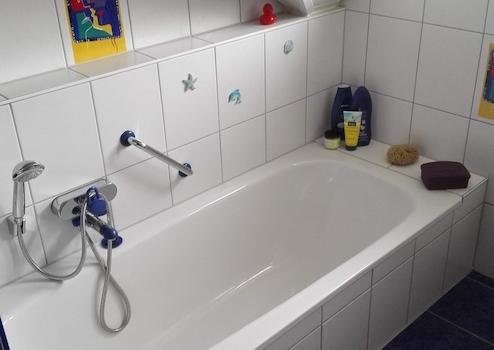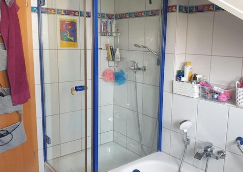 Das Tageslichtbad ist deckenhoch hell gefliest und umfasst eine Glasdusche, eine Badewanne, ein WC als auch ein Handwaschbecken. Zwei Außenfenster sorgen für Frischluftzufuhr.