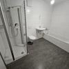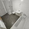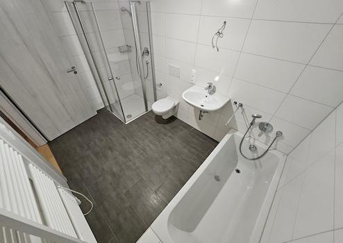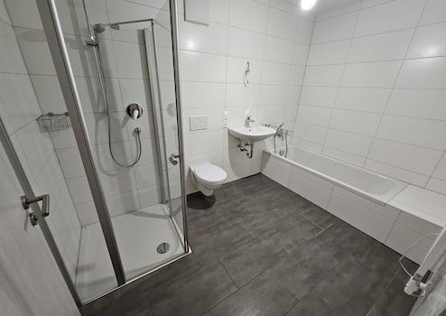 Hell gefliestes Badezimmer mit Dusche, Badewanne und WC