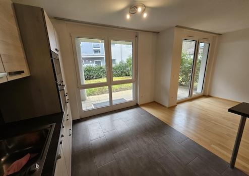 Die Wohnung verfügt über eine großzügige Terrasse mit Blick ins Freie sowie eine gepflegte Einbauküche.