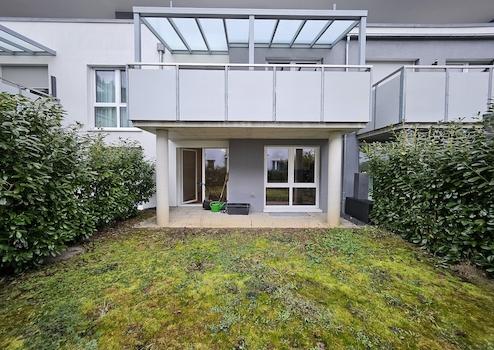 Große Terrasse mit viel Grün, teilweise überdacht