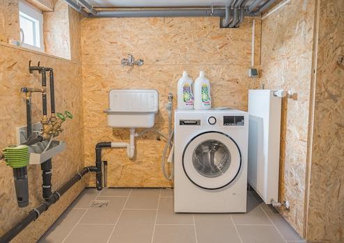 Im Keller befindet sich ein praktischer Waschraum, der Ihnen zusätzlichen Komfort und Stauraum bietet.