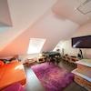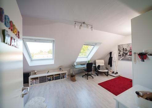 Im weiteren Verlauf der Wendeltreppe wird das Dachgeschoss erreicht. Das Dachgeschoss verfügt über ein separates Duschbad und einem großen, momentan als Home-Office genutzten Raum, der durch vier große Dachflächenfenster lichtdurchflutet wird.