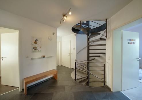 - Die Bodenflächen des 1. OG und die Flure der beiden anderen Etagen sind mit strapazierfähigem Naturschiefer (anthrazit) gefliest