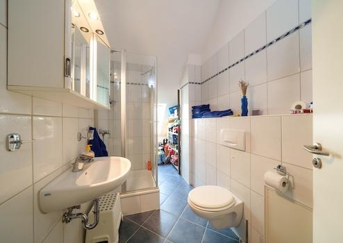 Wie für eine familienfreundliche Wohnung üblich, gehören zu den einladenden Zimmern im 1. OG, bestehend aus Eingangsflur, Küche mit angrenzendem großzügigen und hellen Wohn-/Essbereich sowie zwei abgeschlossene Zimmer, auch ein Gäste-WC. Der Balkon (in Süd-West Lage) ist über ein bodentiefes Doppelfenster im Wohn-/Essbereich angebunden. Alle Zimmer werden durch den zentralen Flur erschlossen. Der intelligent gestaltete Wohn-/Ess-/Küchenbereich erstreckt sich hierbei auf knapp 50m2.
