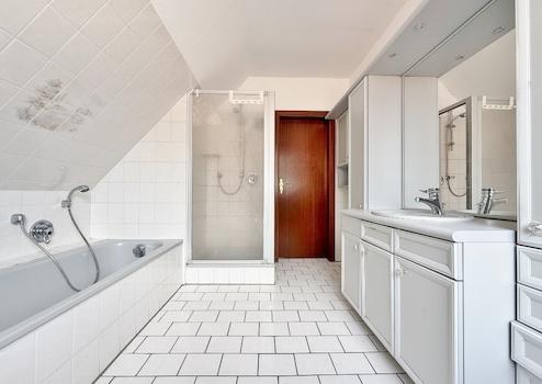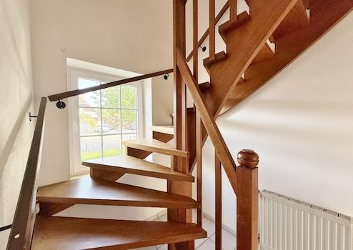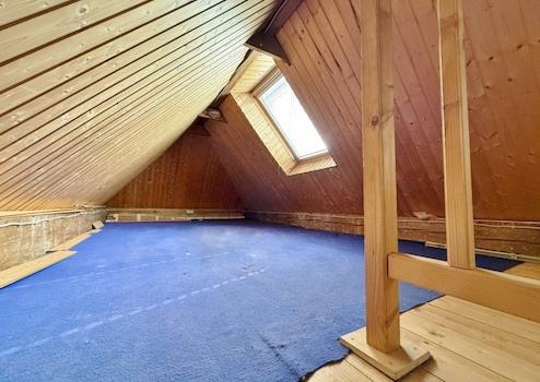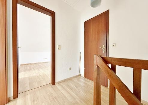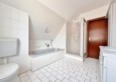 Eine Holztreppe führt Sie ins Obergeschoss, wo sich drei Schlafzimmer befinden. Diese Räume bieten Ihnen vielfältige Nutzungsmöglichkeiten. Ob als Kinderzimmer, Gästezimmer oder als ruhiges Home-Office – hier haben Sie die Flexibilität, die Räume nach Ihren Bedürfnissen zu gestalten. Das Vollbad im Obergeschoss ist mit einer Badewanne sowie einer separaten Dusche ausgestattet.