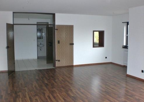 Wohn-/Esszimmer: 38 m², dunkles Laminat, Zugang zur Dachterrasse, funkgesteuerte Rollläden