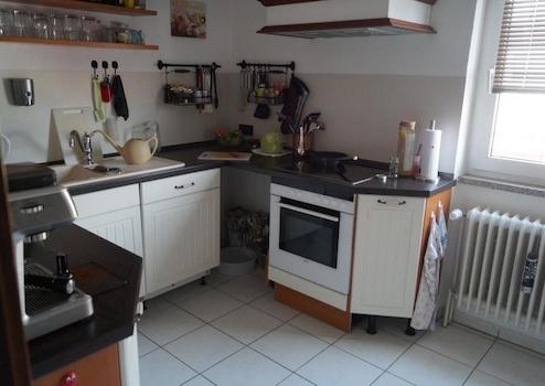 Von hier aus durch eine Diele, in der Sie problemlos eine kleine Garderobe einrichten können, gelangt man in die Küche. Durch das Fenster haben Sie sogar beim Geschirrspülen eine tolle Aussicht über Walldorf.