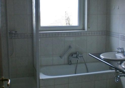 Bad: 7 m², Fliesen, Wanne, Dusche, WC, Doppelwaschbecken mit Granit-Platte, Fenster, Waschmaschinenanschluss