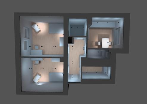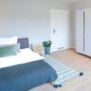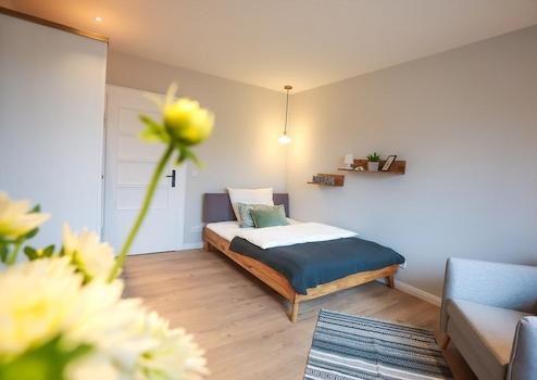 The apartment impresses with its generous area of 60 square meters and its well thought-out room layout. It has two separate rooms, each with a sleeping place, a wardrobe and a table for studying or working.