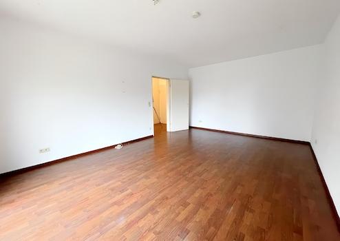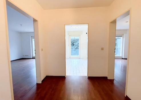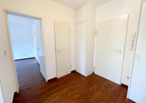 Der zentrale Dielenbereich verbindet alle Räume und bietet dank Einbauschränken praktischen Stauraum. Das lichtdurchflutete Wohnzimmer sowie die separate Küche ebenfalls mit Zugang zum Balkon schaffen ein angenehmes Wohngefühl. Der außergewöhnlich breite, teilweise überdachte Balkon lädt zu entspannten Stunden im Freien ein.