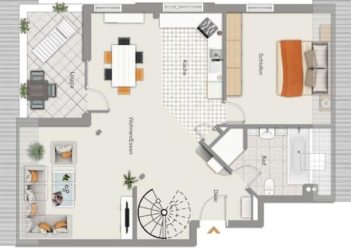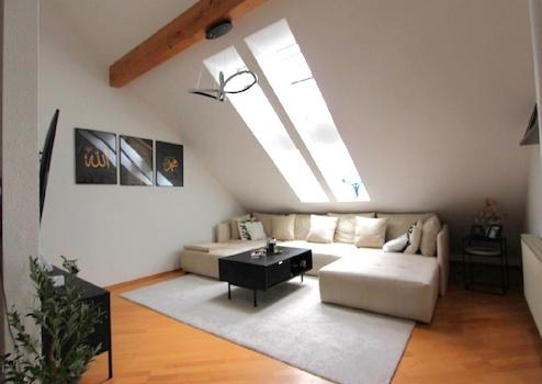 Der großzügige Wohnbereich mit offener Küche und gemütlicher Fernsehecke schafft eine einladende Wohnatmosphäre, ideal zum Entspannen und Zusammensein. Das Tageslichtbad bietet sowohl Dusche als auch Badewanne. Über eine Wendeltreppe gelangt man ins offene Studio im Dachgeschoss perfekt als auch als Arbeits- oder Rückzugsbereich. Die Loggia in Westausrichtung lädt zu entspannten Abendstunden mit Blick ins Grüne ein.