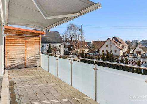 Ein besonderes Highlight ist der großzügige Balkon, der sowohl vom Wohnzimmer als auch vom Schlafzimmer aus zugänglich ist. Dank der elektrischen Markise lässt sich der Außenbereich Richtung Süden flexibel beschatten und bietet zu jeder Tageszeit einen angenehmen Platz zum Entspannen. Zusätzlich steht Ihnen auf dem Balkon ein praktischer Abstellraum zur Verfügung, der wertvollen Stauraum für alles bietet, was nicht täglich benötigt wird.