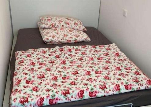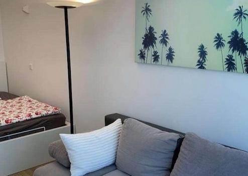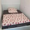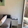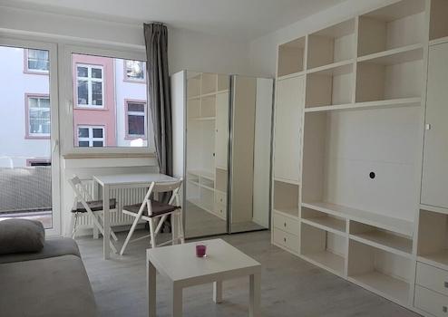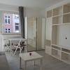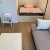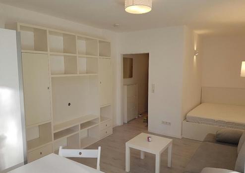 Voll möbliert mit 1,40 m Bett mit Aufbewahrungsfunktion, Schlafcouch, Spiegelschwebetürenschrank, großes Regal mit TV-Rack, Couchtisch