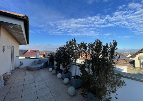Das Obergeschoss mit Galeriecharakter hat die perfekte Aufteilung. Ein Elternschlafzimmer mit Ankleide, einem edlen und großzügigen Badezimmer (mit Dusche und Whirlpool-Badewanne) sowie drei weiteren Kinder- oder Gästezimmern mit eigenem Duschbad sind ideal für die Familie. Die ca. 60 m² große Dachterrasse mit toller Aussicht lädt zum Entspannen, Sonnenbaden und natürlich auch zum Feiern ein. Im luxuriösen, Aluminium-verglasten und -überdachten Jacuzzi-Outdoor-Whirlpool lässt es sich herrlich Entspannen – mit Musik und einem Glas Weißwein vielleicht?