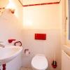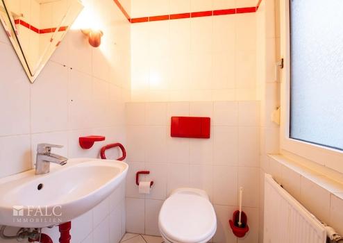 Das Gäste WC ist aus den 90’er Jahren. Es ist raumhoch mit hellen Fliesen gefliest und mit gut erhaltenen Sanitärobjekten ausgestattet.