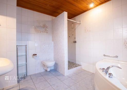 Darüber hinaus besteht vom Wohnzimmer aus ein direkter Zugang zum Hauptbadezimmer. Dieses ist mit einer Badewanne, einer Dusche sowie einem WC ausgestattet und rundet das komfortable Raumangebot des Obergeschosses ab.