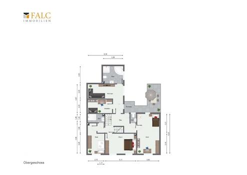 Vom Flur des Obergeschosses aus sind sämtliche Räume dieser Etage bequem erreichbar. Dazu zählen zwei Kinderzimmer, sowie ein Duschbad, ein separates Gäste-WC, ein Elternschlafzimmer und ein Wohnzimmer. Diese zeichnet sich als besonderes Highlight aus, da es ein angrenzendes Arbeitszimmer mit sich bringt, welches sich auch gut als Hobbyraum einrichten lässt. Vom Wohnbereich aus sowie vom Flur gelangt man direkt auf die überdachte Terrasse. Diese bietet Ihnen einen ruhigen Rückzugsort und einen Blick in den Innenhof.