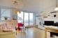 Das Wohnzimmer ist mit Parkettboden, einem Kabel-TV Gerät, einer Couch und einem kleinen Esstisch ausgestattet, Zugang zum Balkon mit Tisch und Stühlen. Die Küche ist etwas abgeteilt, die Einbauküche beinhaltet Herd und Kühlschrank und eine Waschmaschine.