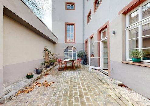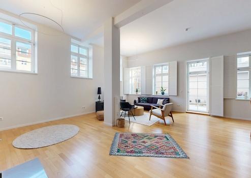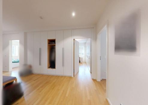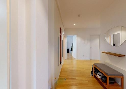 Die exklusive Wohnung ist durch zwei separate Zugänge begehbar. Durch den Haupteingang über das Treppenhaus oder den Fahrstuhl, welcher direkt in die Wohnung führt, sowie durch den Innenhof direkt in den Wohn-Essbereich.