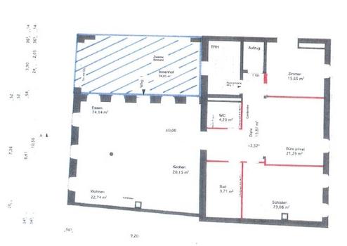 Im Erdgeschoss ( Etage 0 ) befindet sich der lichtdurchflutete Wohn - Essbereich mit offener Küche von ca. 60 qm und der angrenzende Innenhof mit ca. 35 qm.