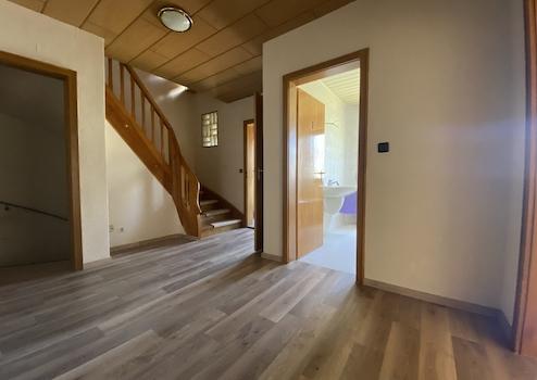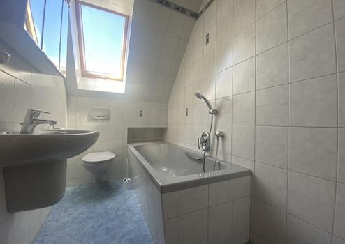 Ebenfalls im Erdgeschoss befindet sich ein Badezimmer mit Dusche und Badewanne. Die große Küche inkl. einer zeitlosen Einbauküche hat ebenfalls einen direkten Zugang zur Terrasse/Garten. Durch die Treppe gelangen Sie in das 1. OG, wo sich die drei Schlafräume und ein weiteres Bad befinden.