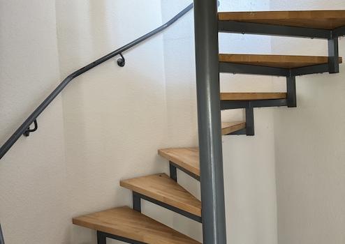 Über die zentrale Wendeltreppe gelangt man in die weiteren Ebenen des Objektes.