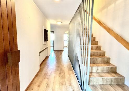 Auch im Erdgeschoss sind die Räume und Flächen überdurchschnittlich groß. Im Flur kann eine größere Garderobe problemlos aufbewahrt werden. Weiter gibt es ein Gäste-WC, ein Büro, die Küche, das große Wohn- und Esszimmer sowie zwei Balkone.