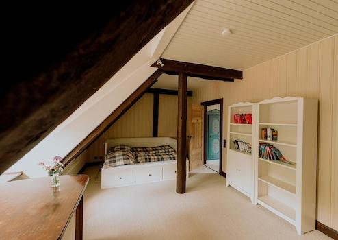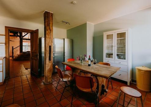 Das Anwesen verfügt über ein traditionelles Reetdach, das über die Jahre laufend gepflegt und teiweise sogarbereits erneuert wurde. Eine moderne Pellets-Heizungsanlage (2025) versorgt das gesamte Haus zuverlässig, auch bei Vollbelegung. Die Innenausstattung ist geprägt von natürlichen Materialien, sichtbarem Ständerwerk und einer warmen, ursprünglichen Raumwirkung.