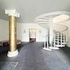 Vom Eingangsbereich gelangt man über eine markante Treppe in das erste Obergeschoss. Hier befinden sich die öffentlichen Räume wie Empfangshalle, Bibliothek und Arbeitsbereich, Esszimmer sowie die angeschlossene Küche. Räumlich abgetrennt vom öffentlichen Teil befindet sich in dieser Ebene auch das Schwimmbad und der Saunabereich, die über ein zweites Treppenhaus zu erreichen sind.