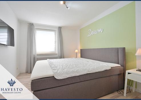 Das Schlafzimmer bietet Platz für ein komfortables Boxspringbett sowie Stauraummöglichkeiten. Das modernisierte Duschbad mit WC rundet den funktionalen Grundriss ab.