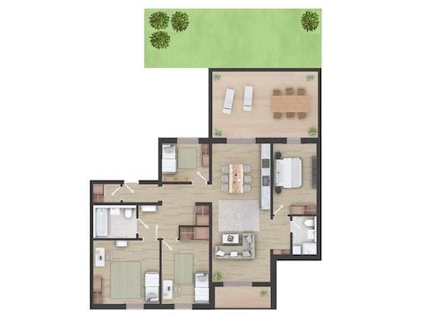 Der geräumige Eingangsbereich bietet ausreichend Platz für eine Garderobe. Der freundliche Empfang führt Sie in das Herzstück der Wohnung: das eindrucksvolle Wohnzimmer mit offener Küche, einem Loggia- sowie einem Zugang auf die ca. 28 m² große Terrasse im grünen Gartenanteil.